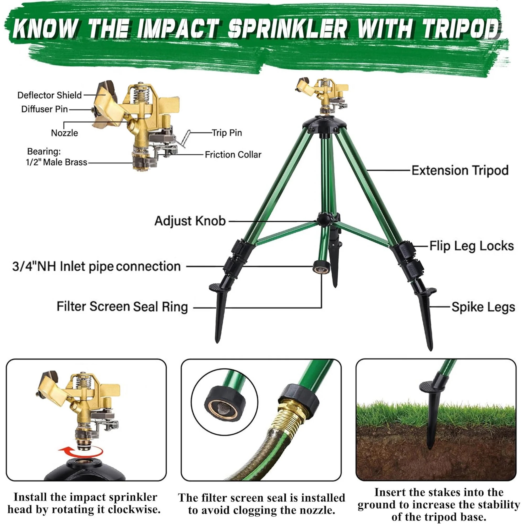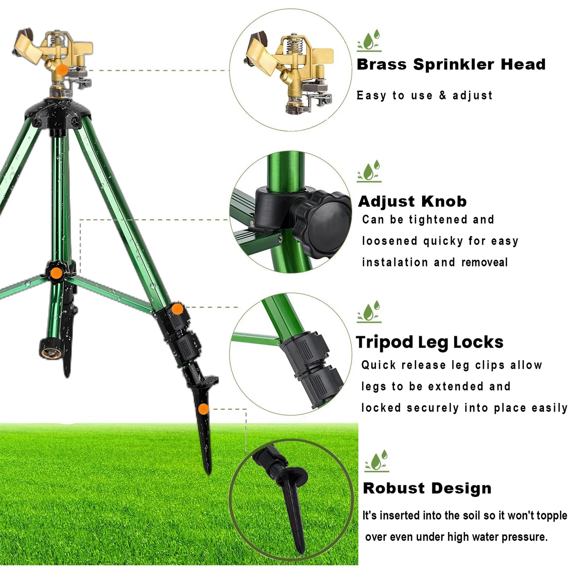 • Complete Package: Includes 1 brass impact sprinkler, 1 tripod base, 1 Teflon tape, and 2 rubber filters, ideal for large yards and gardens.
