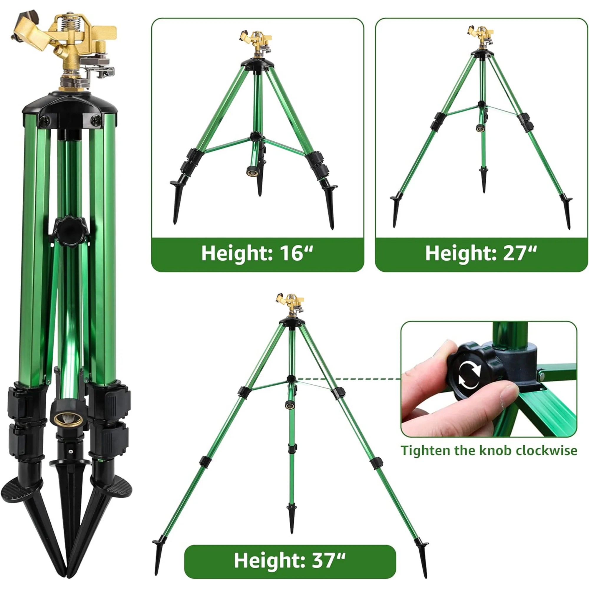 This heavy-duty pulsating sprinkler on an adjustable tripod is perfect for watering large areas up to 90 feet in diameter. The brass sprinkler head can rotate 360 degrees, allowing you to customize the spray pattern and coverage to suit your lawn, garden, or greenhouse needs. The sturdy metal tripod adjusts from 16 to 37 inches in height, providing versatile placement options. Designed for dependability, the clog-resistant impact head ensures uninterrupted water flow, even with dirty or reclaimed water. This durable tripod sprinklers for yard large area is easy to set up and use, saving you time and water while keeping your outdoor spaces lush and thriving.